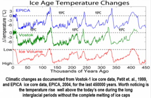 Εικόνα 4. Θερμοκρασιακές διακυμάνσεις κατά τα τελευταία 450000 χρόνια. Άξιον παρατήρησης είναι το πόσες φορές είχαμε θερμοκρασίες πάνω από την σημερινή μέση γήινη θερμοκρασία των 15 C για πολλά χρόνια χωρίς να λιώσουν οι πάγοι. Αυτό δείχνουν οι πάγο-κολώνες Vostok-1 και EPICA.