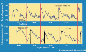 Παρατηρούμε επίσης ότι η άνοδος της ατμοσφαιρικής περιεκτικότητας σε διοξείδιο του άνθρακος διαμέσου των αιώνων έπεται της ανόδου της θερμοκρασίας σε όλες τις μέσο-παγετώδεις περιόδους (περιόδους μεταξύ παγετώνων). Ήτοι παρουσιάζει χρονική υστέρηση έναντι της ανόδου της θερμοκρασίας (εικόνα 7) γεγονός που μας οδηγεί στο να συμπεράνουμε ότι η άνοδος της ατμοσφαιρικής περιεκτικότητας σε διοξείδιο του άνθρακος είναι το αποτέλεσμα της ανόδου της γήινης μέσης θερμοκρασίας.