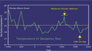Εικόνα 9. Διακύμανση των επιφανειακών θερμοκρασιών στην θάλασσα των Σαργασών τα τελευταία 3000 χρόνια ( Μετρήσεις μέχρι το 1975) βάση των ισοτοπικών μετρήσεων δ 180 στο πλαγκτόν Globigerinoides rubber, Keigwin, L.D., Science 274: 1504-1508. Φανερά είναι τα θερμοκρασιακά μέγιστα της Ρωμαϊκής Εποχής και το Μεσαιωνικό Μέγιστο.