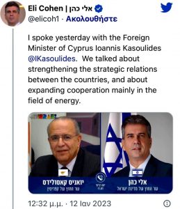 Σε σημερινή του ανάρτηση στο Twitter σχετικά με την επικοινωνία, ο υπουργός Εξωτερικών του Ισραήλ αναφέρει πως μίλησε με τον Ιωάννη Κασουλίδη για την ενίσχυση των στρατηγικών σχέσεων μεταξύ των δύο χωρών, και για διεύρυνση της συνεργασίας, κυρίως στον τομέα της ενέργειας.