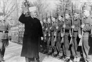 Ο al-Husseini χαιρετών ναζιστικά τους νεοσύλλεκτους στα S.S. Βόσνιους μουσουλμάνους, Νοέμβριος 1943 λίγο μετά την σφαγή της Πρίστινα. Πηγή: What role did the Grand Mufti play in the Holocaust?, The Voice of Berlin, Bz-berlin.de.