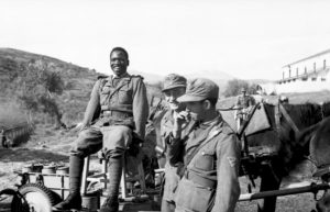 Άραβες μισθοφόροι των Nαζί: Λόχος των Μαροκινών, υπό τον Γάλλο λοχαγό Άντρέ Ρουέν, εξ Αλσατίας, ο οποίος προέβη στις ανωτέρω ωμότητες, την 17.04.1944, στην Καλοσκοπή (Ν. Φωκίδος). Στο βάθος, από αριστερά προς τα δεξιά, το Μαύρο Λιθάρι (δυτική πλευρά), ο Κοκκινόβραχος της Αγίας Μαρίνας, οι κορυφές Λιάκουρα, ο Καλόγηρος και ο Κούκος και ριπίδιο και ρήγμα Τιθορέας (σπηλιά του Ανδρούτσου, Βελίτσα). Πηγή: Βοιωτία. Ιστορικά Θέματα: Αραβες μισθοφόροι των ναζί3. Μια φωτογραφία από την Κατοχή, Viotiastory.blogspot.com.