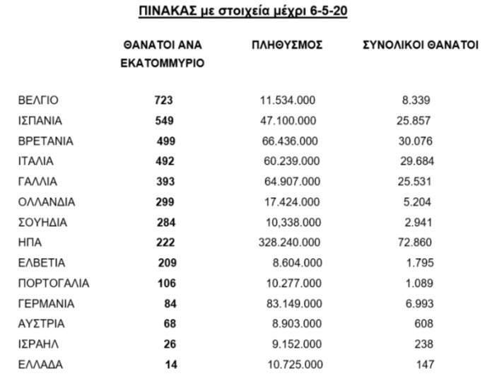 Η ελληνική κυβέρνηση, έχοντας την αμέριστη στήριξη του μηχανισμού προπαγάνδας, καλλιεργεί το αφήγημα ότι έλαβε εγκαίρως τα απαραίτητα μέτρα και έτσι σώθηκαν πολλές ζωές. Η αλήθεια είναι ότι στην πατρίδα μας έχουν καταγραφεί λίγοι θάνατοι από την Covid-19, αλλά αυτό δεν είναι βασικά το αποτέλεσμα των κυβερνητικών μέτρων. Τα ίδια μέτρα ελήφθησαν και σε πολλές άλλες χώρες, οι οποίες όμως έχουν καταγράψει πολλαπλάσια θύματα (βλέπε πίνακα)Η Ελλάδα είχε την τύχη, όταν διαπιστώθηκε (26-2-20) η πρώτη ασθενής στη Θεσσαλονίκη, να υπάρχει πολύ μικρή διασπορά του ιού στην κοινότητα. Έτσι όταν άρχισαν να εφαρμόζονται τα περιοριστικά μέτρα, αυτά είχαν πολύ μεγαλύτερη αποτελεσματικότητα γιατί οι φορείς του ιού ήταν σχετικά λίγοι. Παράλληλα βοήθησαν τα ιδιαίτερα χαρακτηριστικά της ελληνικής κοινωνίας, όπως ο σχετικά μικρός πληθυσμός υπερηλίκων σε οίκους ευγηρίας, στους οποίους σ’ άλλες χώρες σημειώθηκαν εκατόμβες.