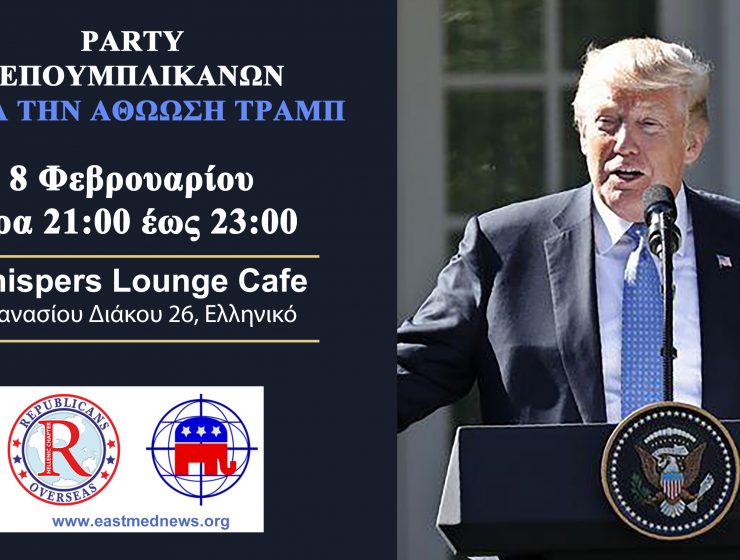 Το παράρτημα Ρεπουμπλικανικού Κόμματος των ΗΠΑ στην Ελλάδα, διοργανώνει στις 8 Φεβρουαρίου 2020 και ώρα 21:00 έως 23:00…
