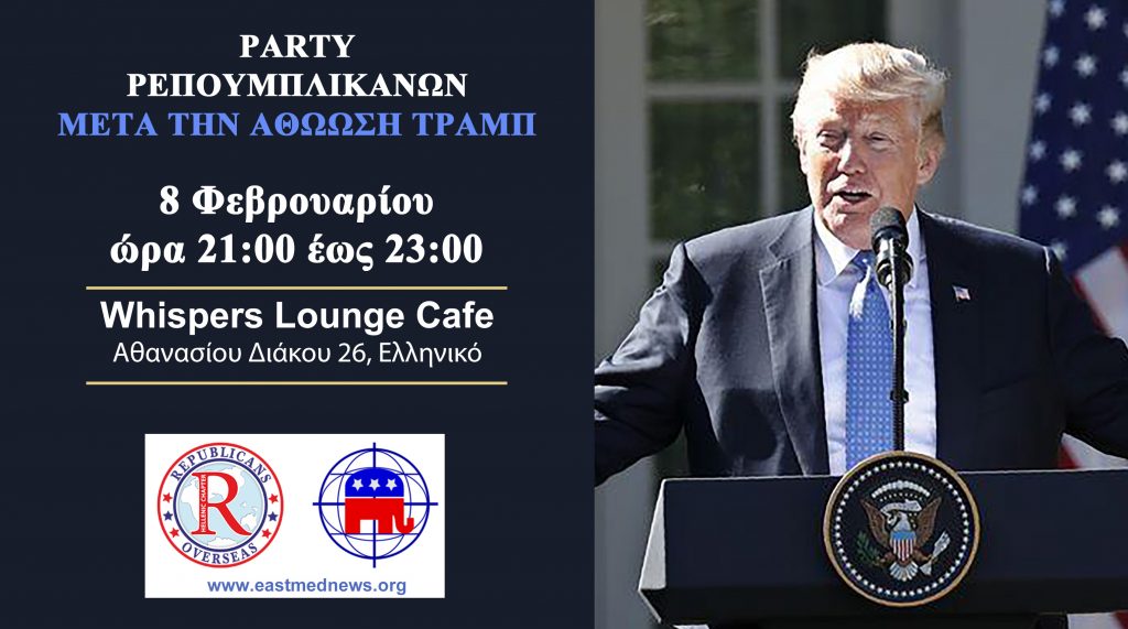 Το παράρτημα Ρεπουμπλικανικού Κόμματος των ΗΠΑ στην Ελλάδα, διοργανώνει στις 8 Φεβρουαρίου 2020 και ώρα 21:00 έως 23:00 πολιτική εκδήλωση για τον εορτασμό της παταγώδους αποτυχίας του σχεδίου του «Δημοκρατικού» κόμματος στις ΗΠΑ για καθαίρεση του Προέδρου Τράμπ.